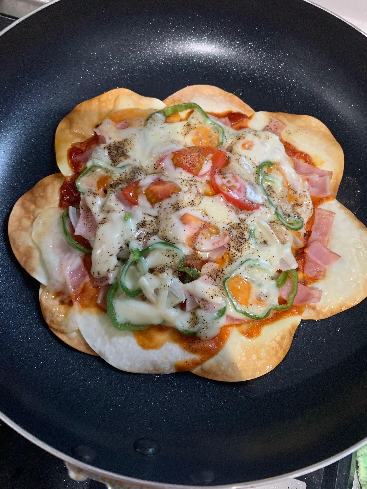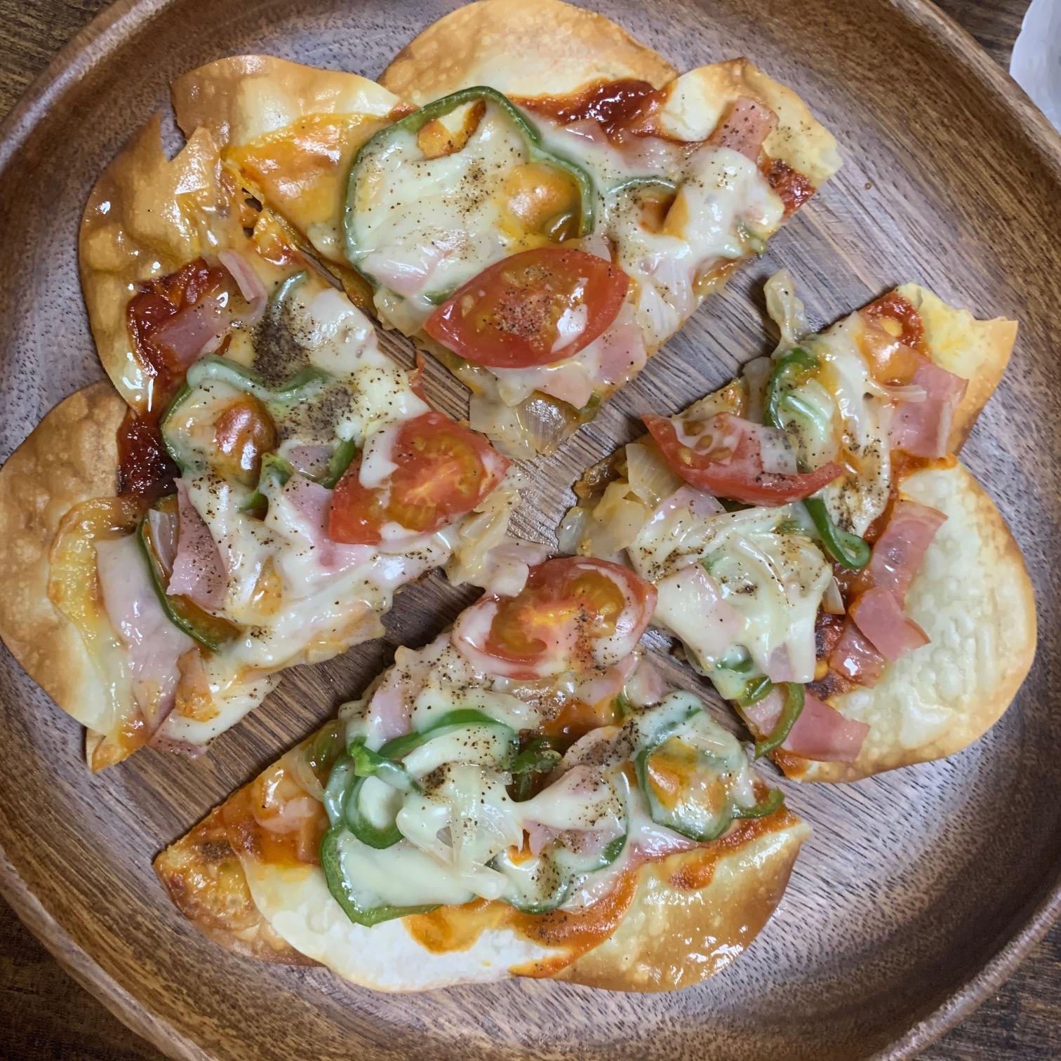 最近家で、餃子の皮でピザをつくってみたんですがめっちゃ簡単だしおいしくできました🍕