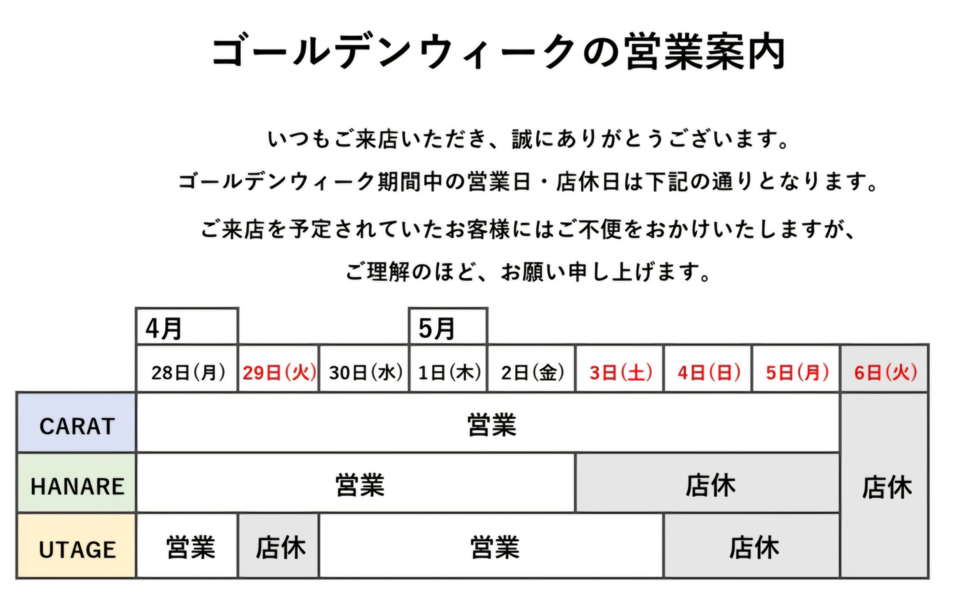 CARATは、ゴールデンウィーク期間中も元気に営業いたします!