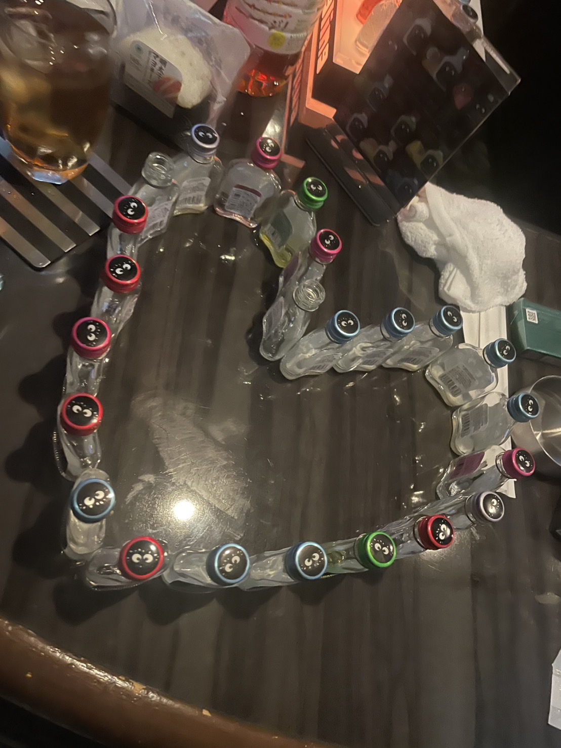 みんなまぁまぁベロベロだったのに、宴に置いてあるクライナーをたくさん飲んで、その後に空き瓶で❤️を女の子が作ってくれました😇笑